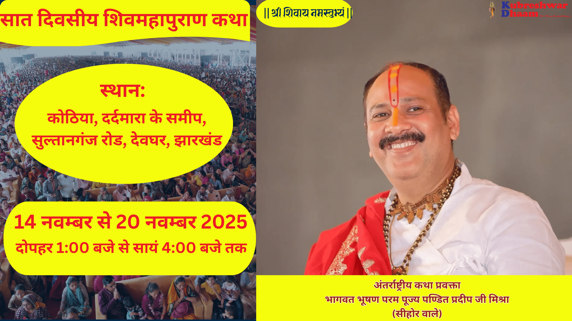 श्री विठ्ठलेश सेवा समिति, सीहोर के पावन तत्वावधान में, 14 नवम्बर से 20 नवम्बर 2025 तक यह सात दिवसीय कथा, कोठिया, दर्दमारा के समीप, सुल्तानगंज रोड, देवघर स्थित विशाल कथा पंडाल में चल रही है। दोपहर 1:00 बजे से सायं 4:00 बजे तक चलने वाली यह कथा केवल देवघर ही नहीं, बल्कि संपूर्ण विश्व के शिवभक्तों के लिए आध्यात्मिक ऊर्जा का स्रोत बन गई है।